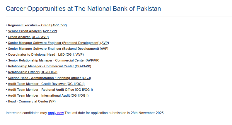 Latest Government jobs in National Bank of Pakistan NBP in Bank and others can be applied till 26 November 2025 or as per closing date in newspaper ad. Read complete ad online to know how to apply on latest National Bank of Pakistan NBP job opportunities.