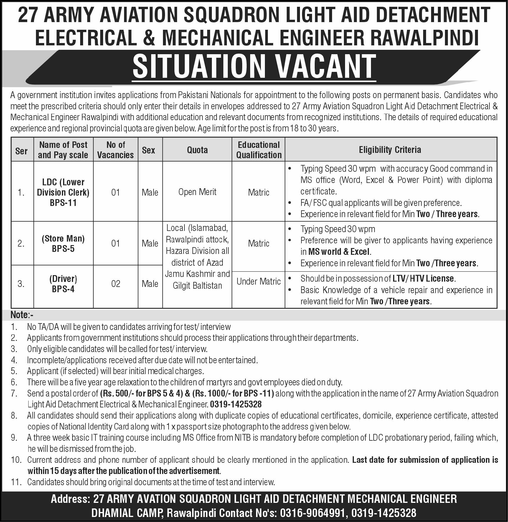 27 Army Aviation Squadron Rawalpindi Jobs 2026, Last Date 07-05-2026