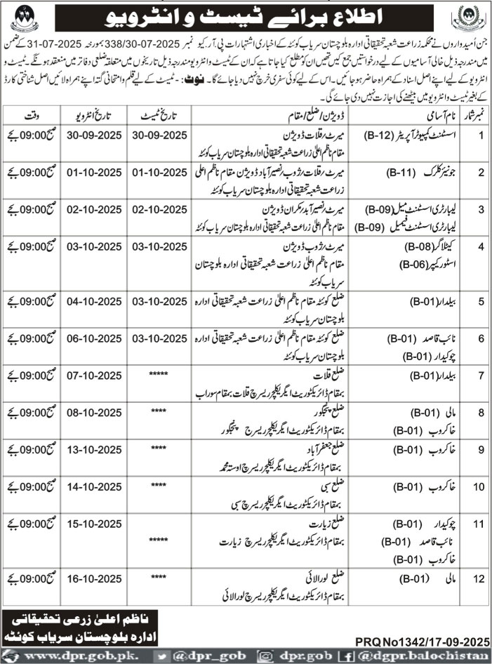 Agriculture Department Quetta Jobs, Last Date 16-10-2025