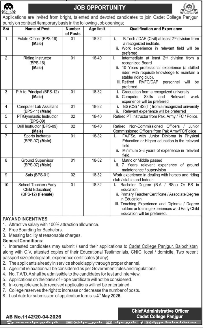When it comes to career opportunities, Cadet College Panjgur jobs are highly attractive for individuals seeking employment in the education and administration sectors. The college regularly offers vacancies for teaching and non-teaching staff, including lecturers, subject teachers, administrative officers, clerks, and support staff. These Cadet College Panjgur careers are open to candidates with qualifications ranging from Intermediate and Bachelor’s degrees to Master’s and professional teaching credentials. The institution also provides opportunities for physical training instructors and hostel management staff, making it suitable for a wide range of applicants. Employees benefit from a disciplined work environment, accommodation facilities, and opportunities for professional development.