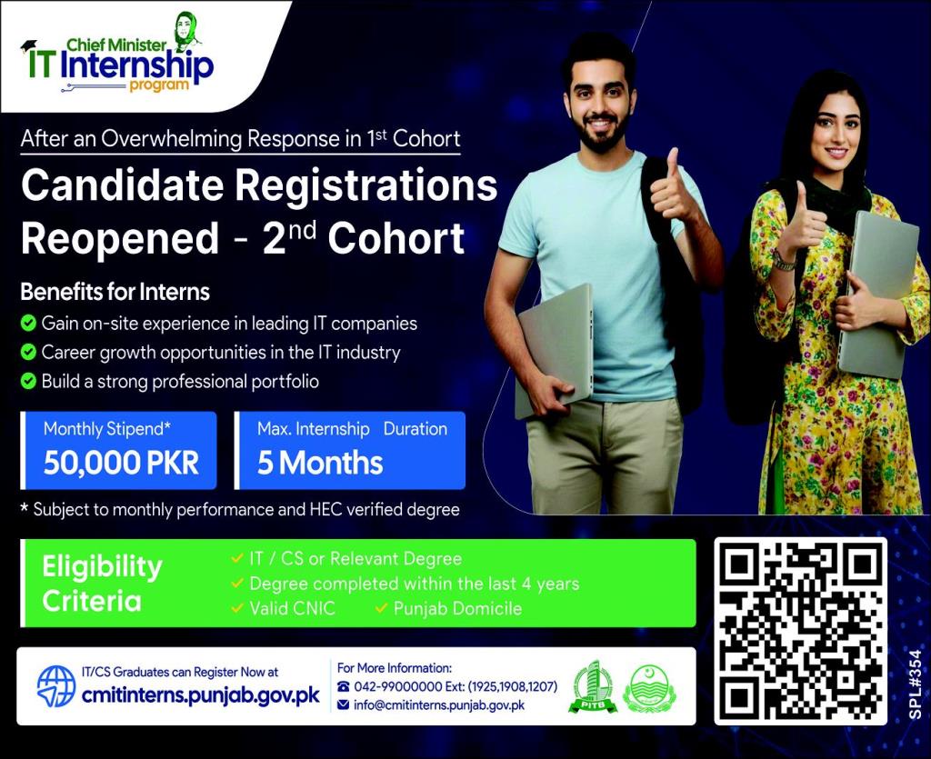 Chief Minister Punjab IT Internship Program is a flagship initiative launched by the Government of Punjab to empower young graduates with practical skills in the field of information technology. Designed to bridge the gap between academic knowledge and industry requirements, this program provides hands-on training, professional exposure, and real-world experience to fresh graduates across Punjab. The initiative focuses on developing expertise in areas such as software development, web design, data analysis, digital marketing, and IT support. By equipping youth with modern technological skills, the Chief Minister Punjab IT Internship Program plays a significant role in boosting employability and supporting the growth of Pakistan’s digital economy.