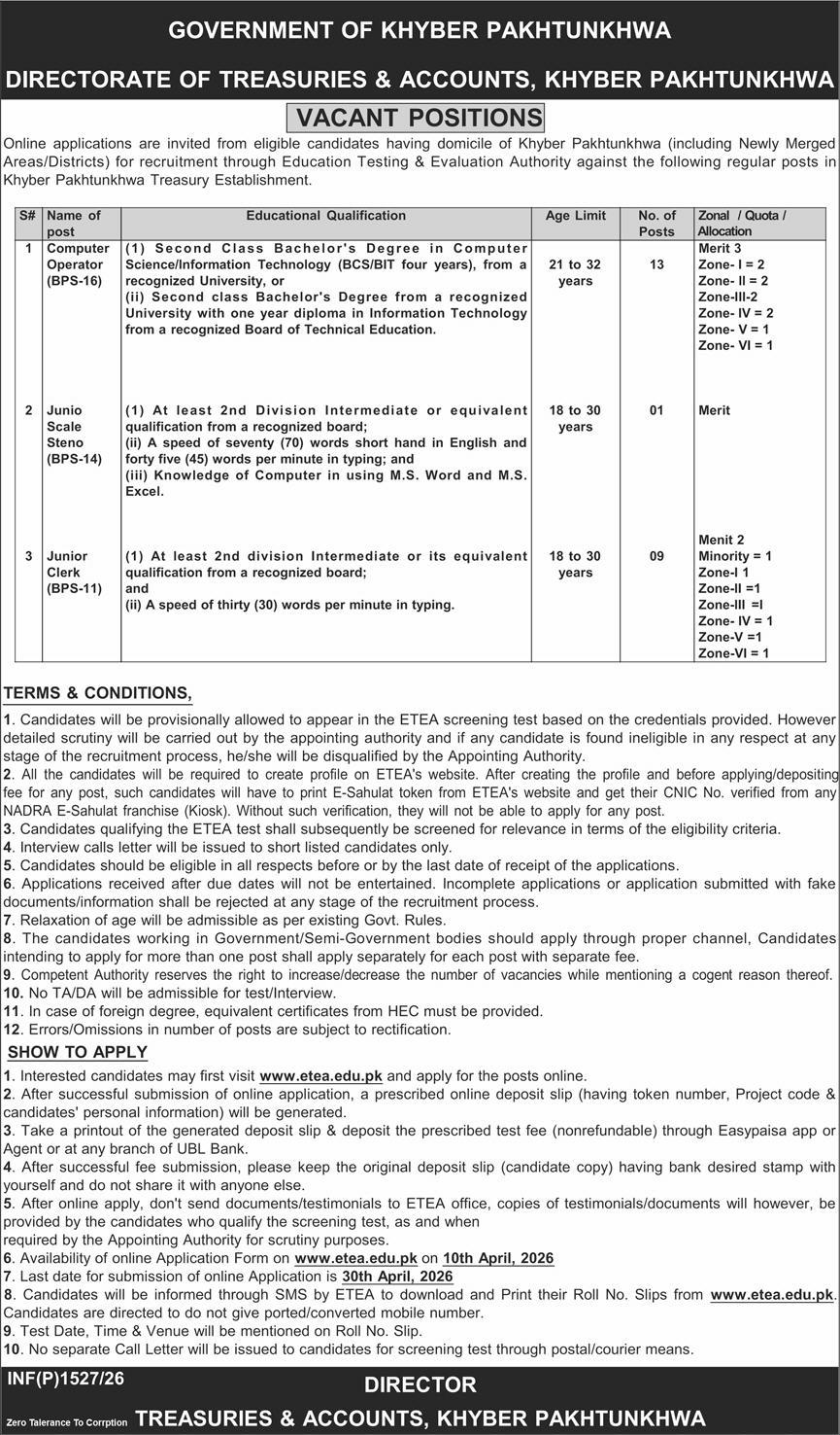 Directorate of Treasuries & Accounts Khyber Pakhtunkhwa jobs are highly desirable for individuals seeking careers in finance, accounting, and public administration. The department regularly announces various job opportunities for positions such as accountants, auditors, computer operators, data entry operators, clerks, and administrative staff. These roles are open to candidates with qualifications ranging from Intermediate and Bachelor’s degrees to professional certifications in accounting and finance. Both fresh graduates and experienced professionals can apply, making it an excellent option for those looking to build a stable government career. Employees benefit from competitive salary packages, job security, pension plans, and opportunities for professional growth within the public sector.