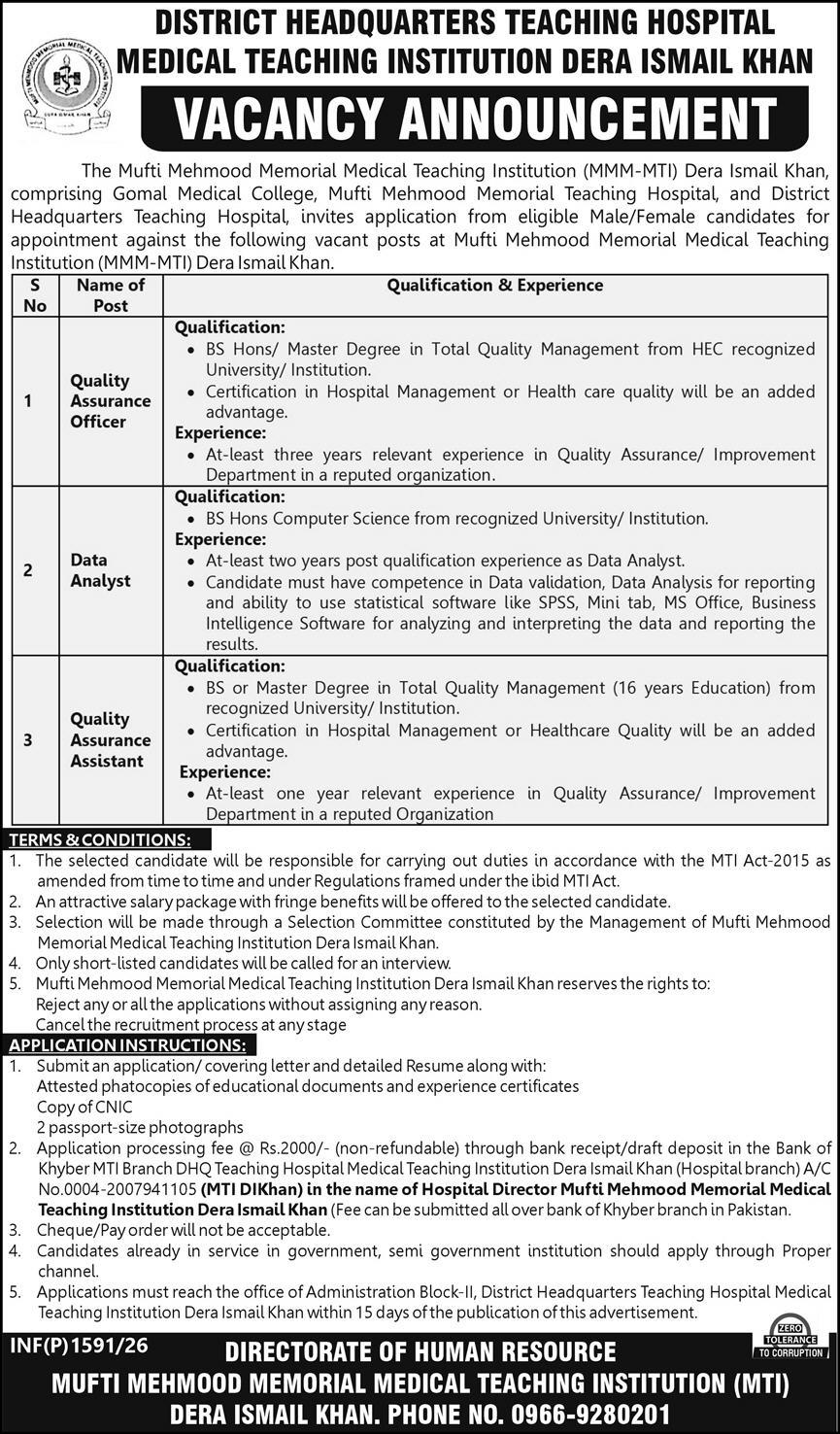 District Headquarter Teaching Hospital DHQ DI Khan jobs are highly attractive for individuals seeking careers in the healthcare and public sector. The hospital regularly announces a variety of job opportunities in both clinical and administrative fields. Positions such as doctors, nurses, medical technicians, pharmacists, lab assistants, and administrative staff are commonly advertised. These roles are open to candidates with qualifications ranging from Matric and Intermediate to MBBS, Bachelor’s, and Master’s degrees, making them suitable for both fresh graduates and experienced professionals. Working at DHQ Teaching Hospital provides a professional environment, competitive salary packages, and opportunities for career growth through hands-on experience and training in a busy healthcare setting.