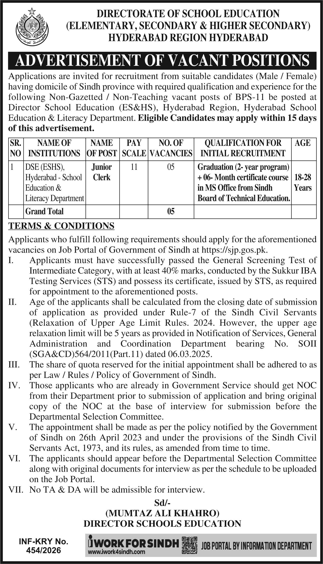 - Junior Clerk PPS-11 (05 Posts)