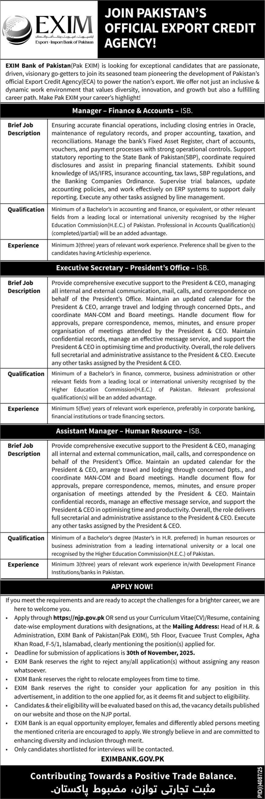 Exim Bank of Pakistan Islamabad jobs are highly attractive for professionals seeking careers in banking, finance, trade facilitation, administration, and project management. Candidates searching for the latest Exim Bank of Pakistan Islamabad jobs in Pakistan can find detailed information about vacancies, eligibility criteria, and application procedures through official announcements and trusted job portals. Working with Exim Bank of Pakistan offers a prestigious and rewarding opportunity to contribute to Pakistan’s international trade, economic growth, and financial development while building a stable government career in the banking sector.