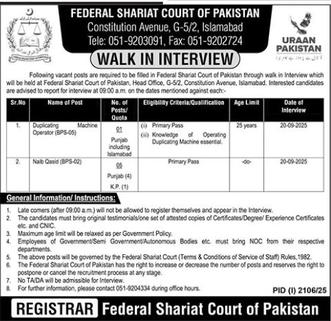 Federal Shariat Court latest Government Management jobs and others can be applied till September 27, 2025 or as per closing date in newspaper ad. Read complete ad online to know how to apply on latest Federal Shariat Court job opportunities.