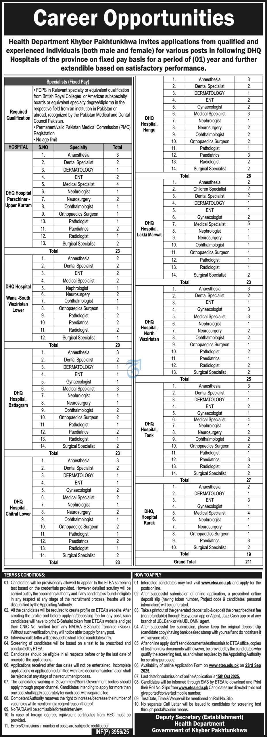 Health Department latest Government Medical jobs and others can be applied till 15 October 2025 or as per closing date in newspaper ad. Read complete ad online via ETEA to know how to apply on latest Health Department job opportunities.