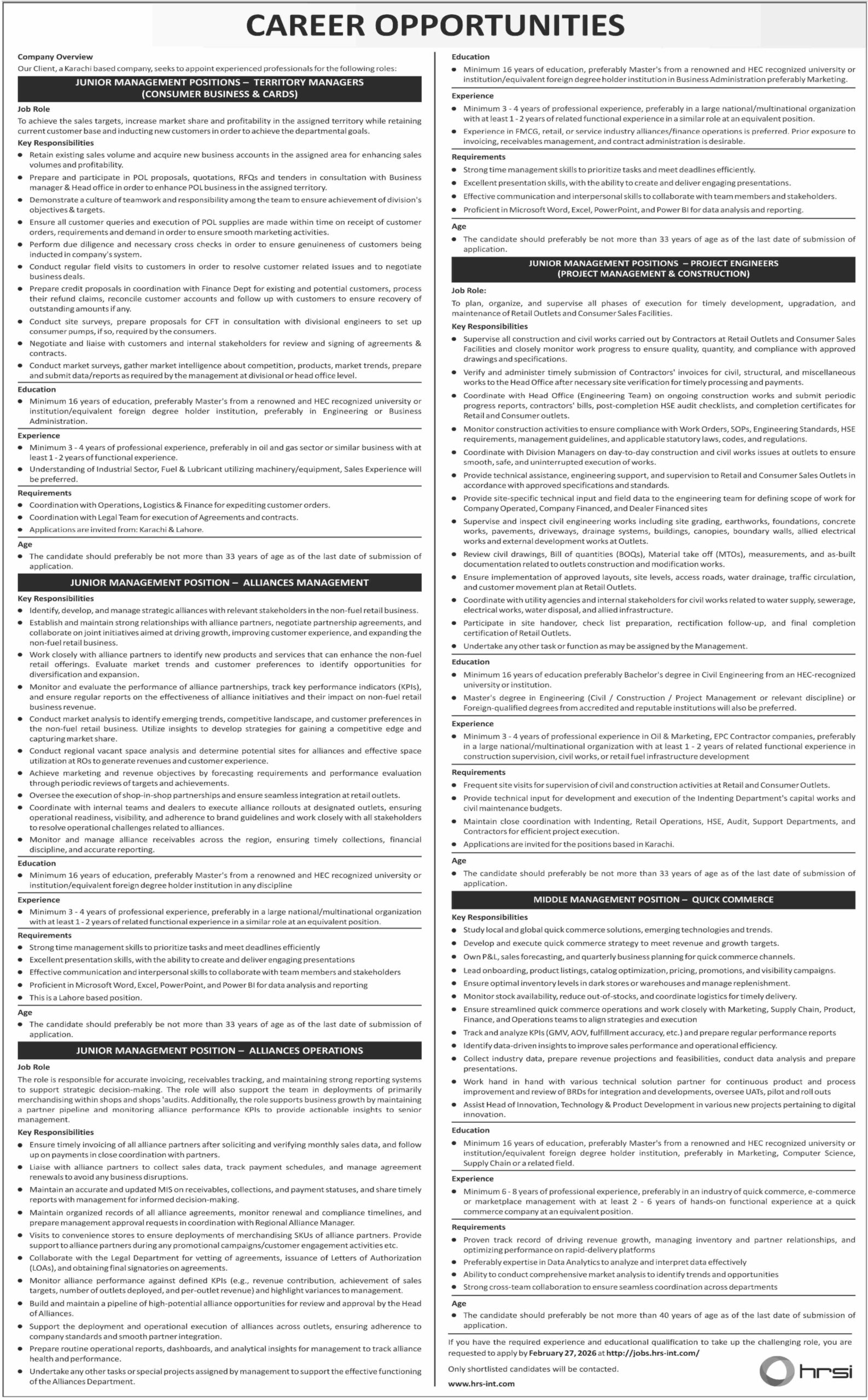 Human Resource Solutions International HRSI latest Government Management jobs and others can be applied till 27 February 2026 or as per closing date in newspaper ad. Read complete ad online to know how to apply on latest Human Resource Solutions International HRSI job opportunities.