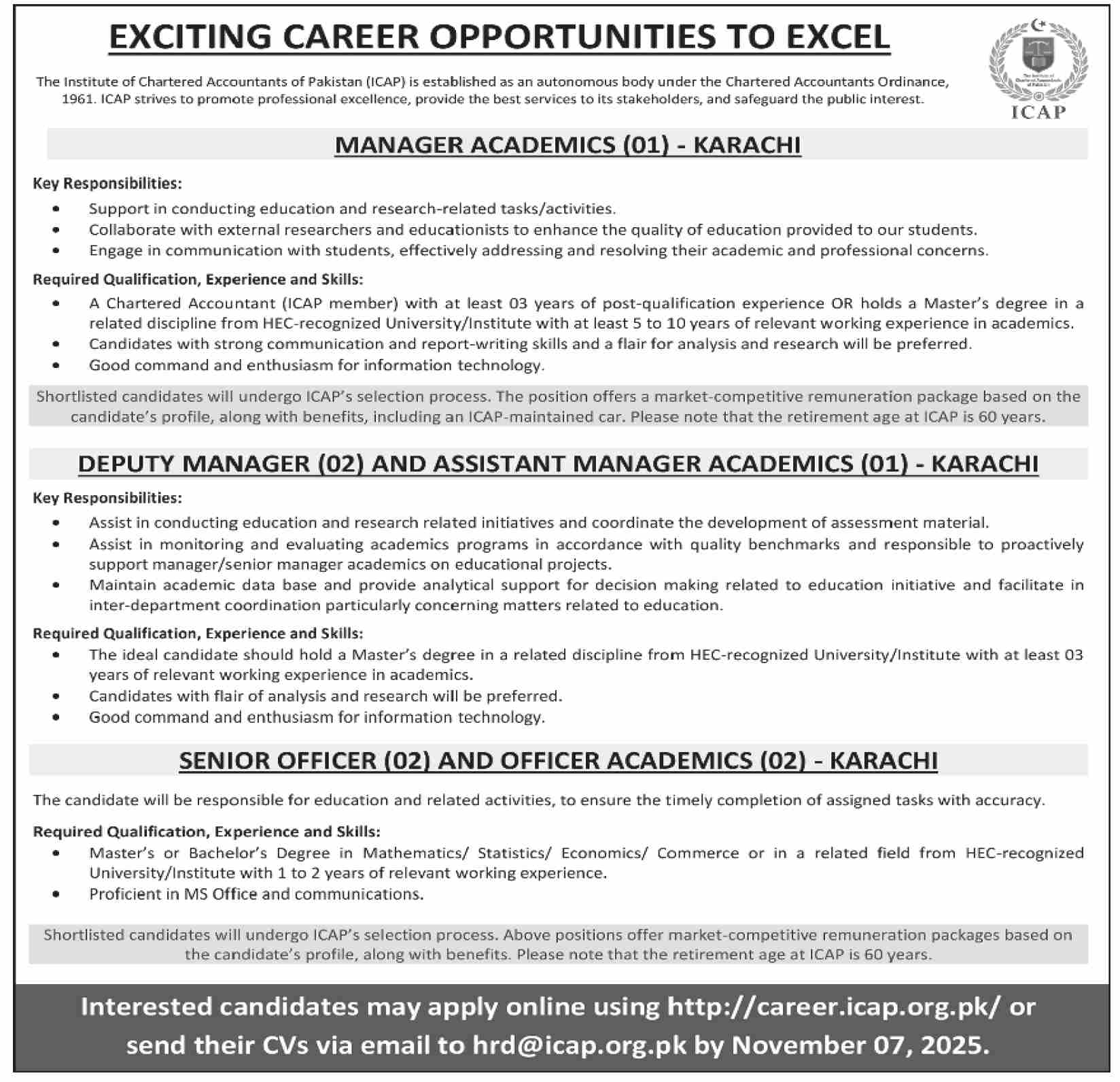 Apply at Institute of Chartered Accountants of Pakistan ICAP latest Government jobs in Management and departments before closing date which is around November 7, 2025 or as per closing date in newspaper ad. Read complete ad online to know how to apply on latest Institute of Chartered Accountants of Pakistan ICAP job opportunities.
