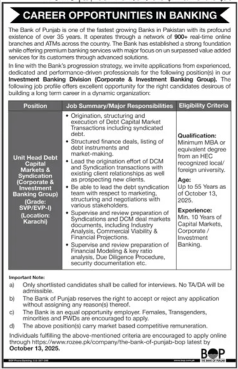 Latest Government jobs in The Bank of Punjab BOP in Bank and others can be applied till 13 October 2025 or as per closing date in newspaper ad. Read complete ad online to know how to apply on latest The Bank of Punjab BOP job opportunities.