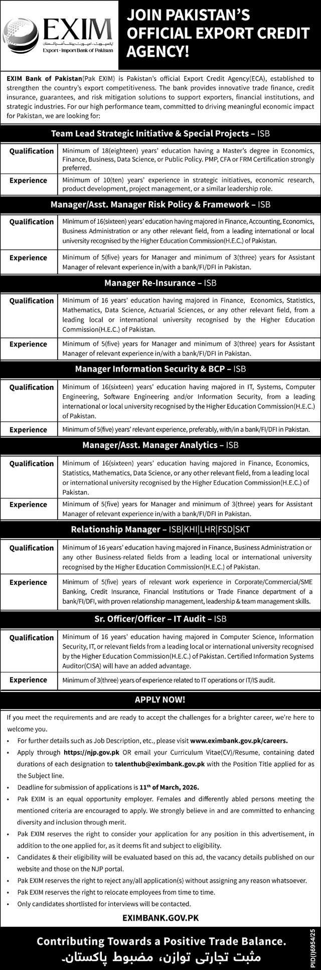 Exim Bank of Pakistan jobs offer excellent career opportunities in banking, finance, risk management, trade finance, and administration. Candidates searching for the latest Exim Bank of Pakistan jobs can find detailed information about vacancies, eligibility criteria, and application procedures through official announcements and trusted job portals.