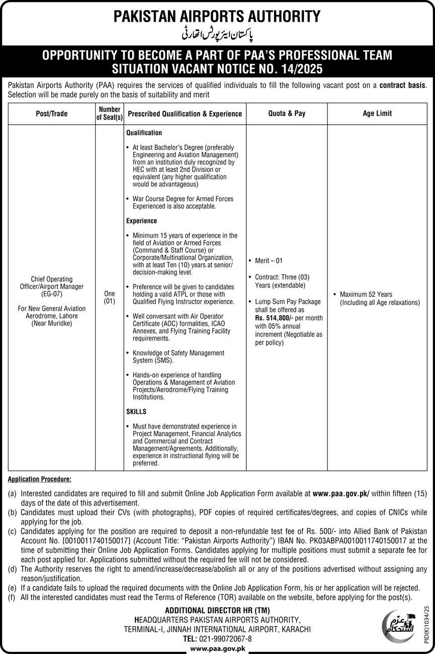 Vacant posts including airport manager and chief operating officer are announced in Pakistan Airports Authority PAA Karachi, karachi Sindh Pakistan as per 26 September 2025 advertisement in daily Express Newspaper. Candidates with Bachelor etc. educational background will be preferred.