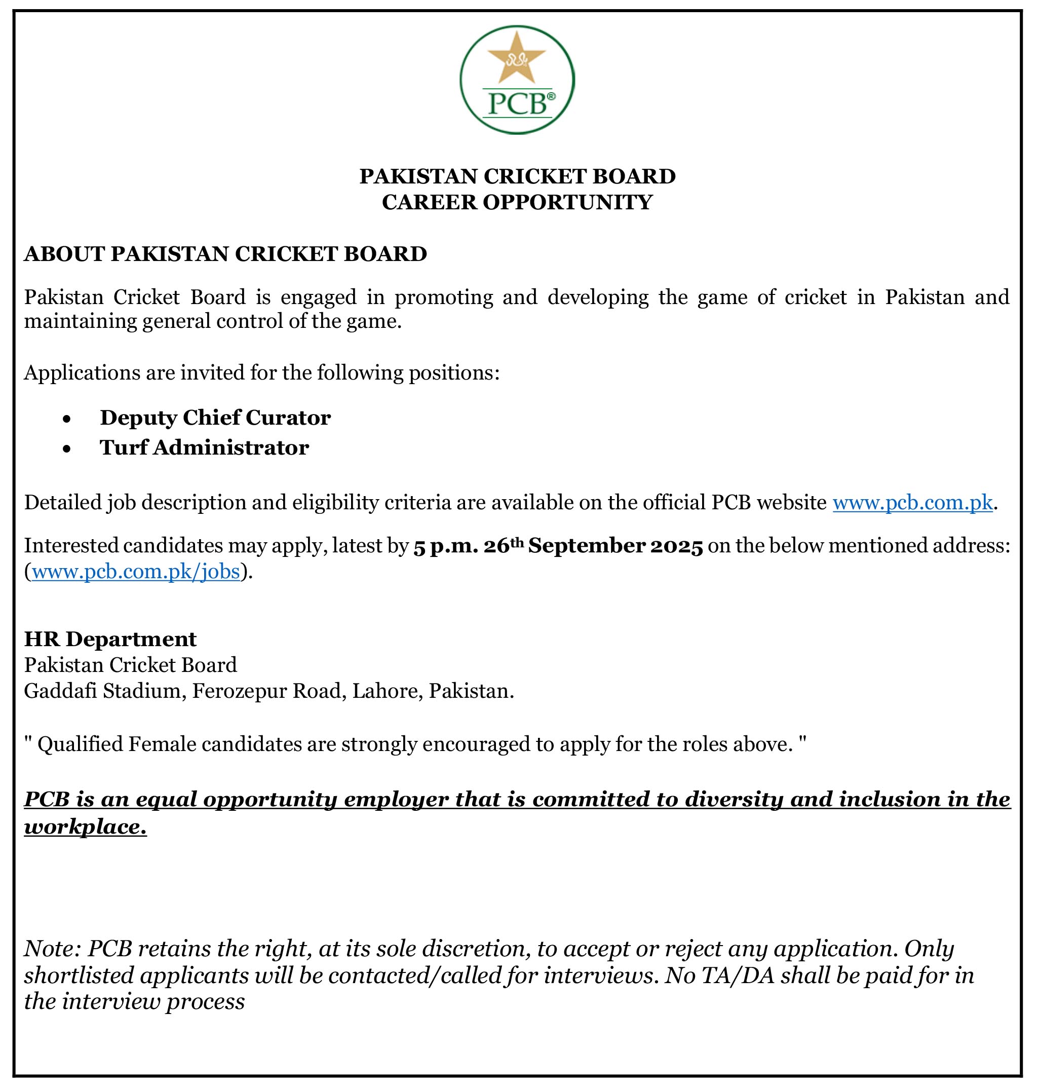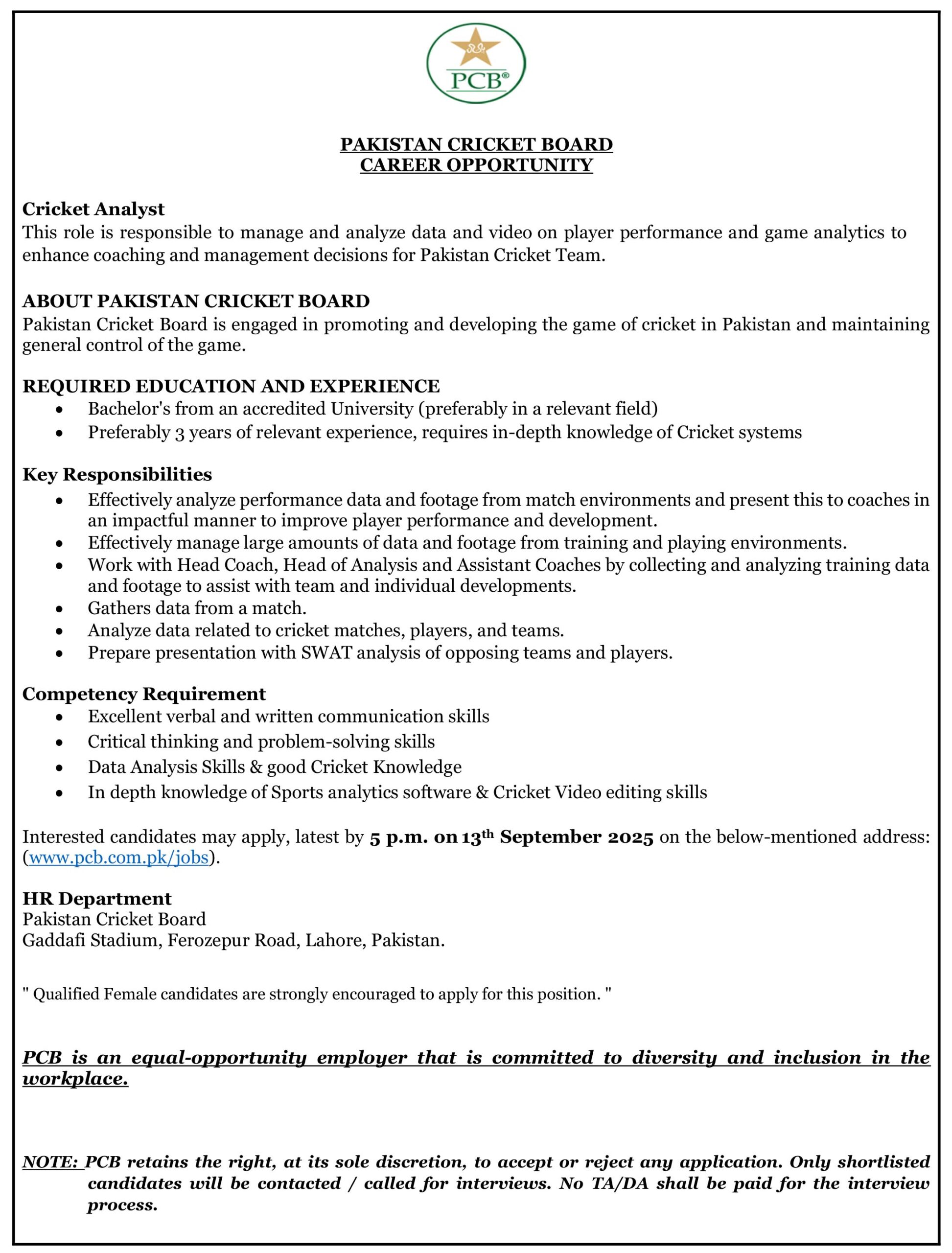 Pakistan Cricket Board PCB latest Government Management jobs and others can be applied till 26 September 2025 or as per closing date in newspaper ad. Read complete ad online to know how to apply on latest Pakistan Cricket Board PCB job opportunities.