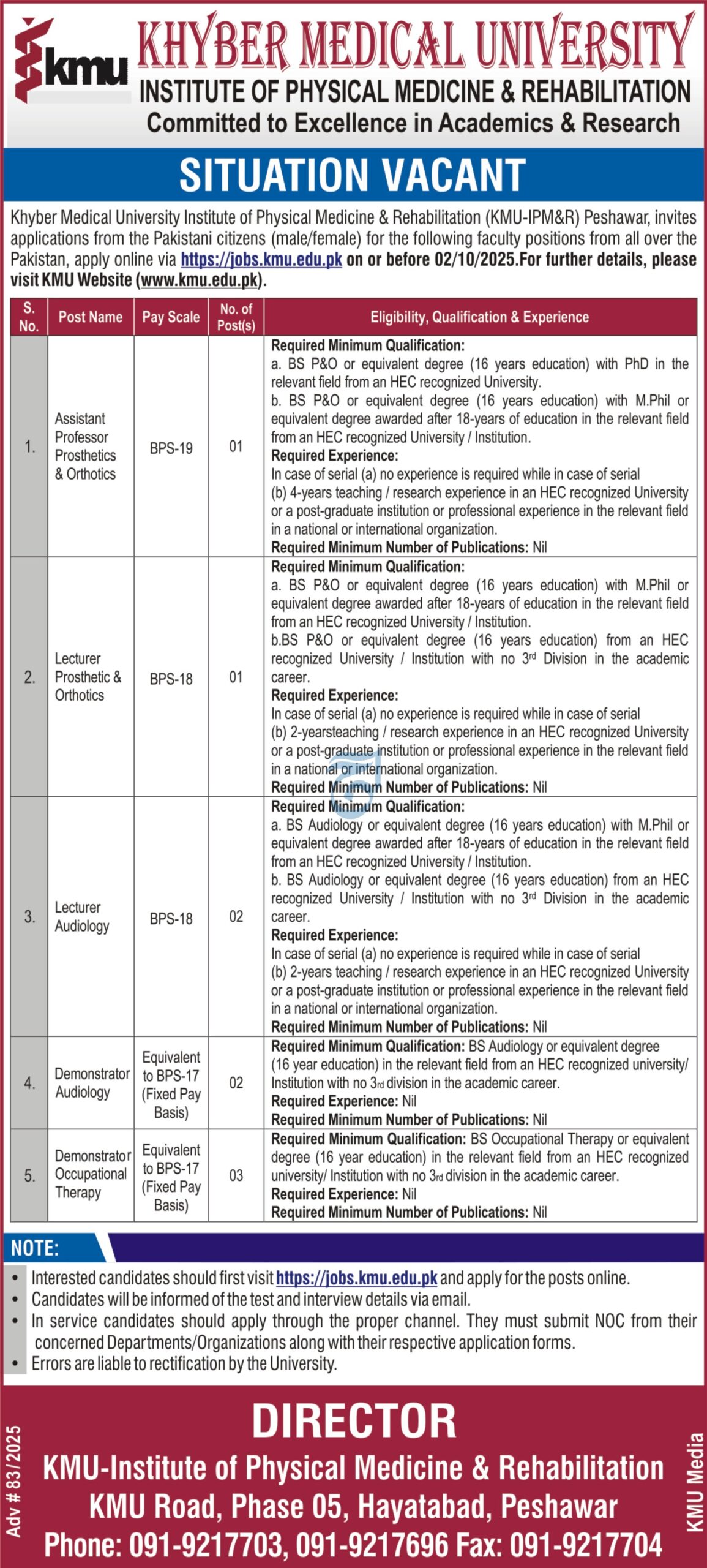 Apply at Khyber Medical University KMU latest Government jobs in Education and departments before closing date which is around October 2, 2025 or as per closing date in newspaper ad. Read complete ad online to know how to apply on latest Khyber Medical University KMU job opportunities.