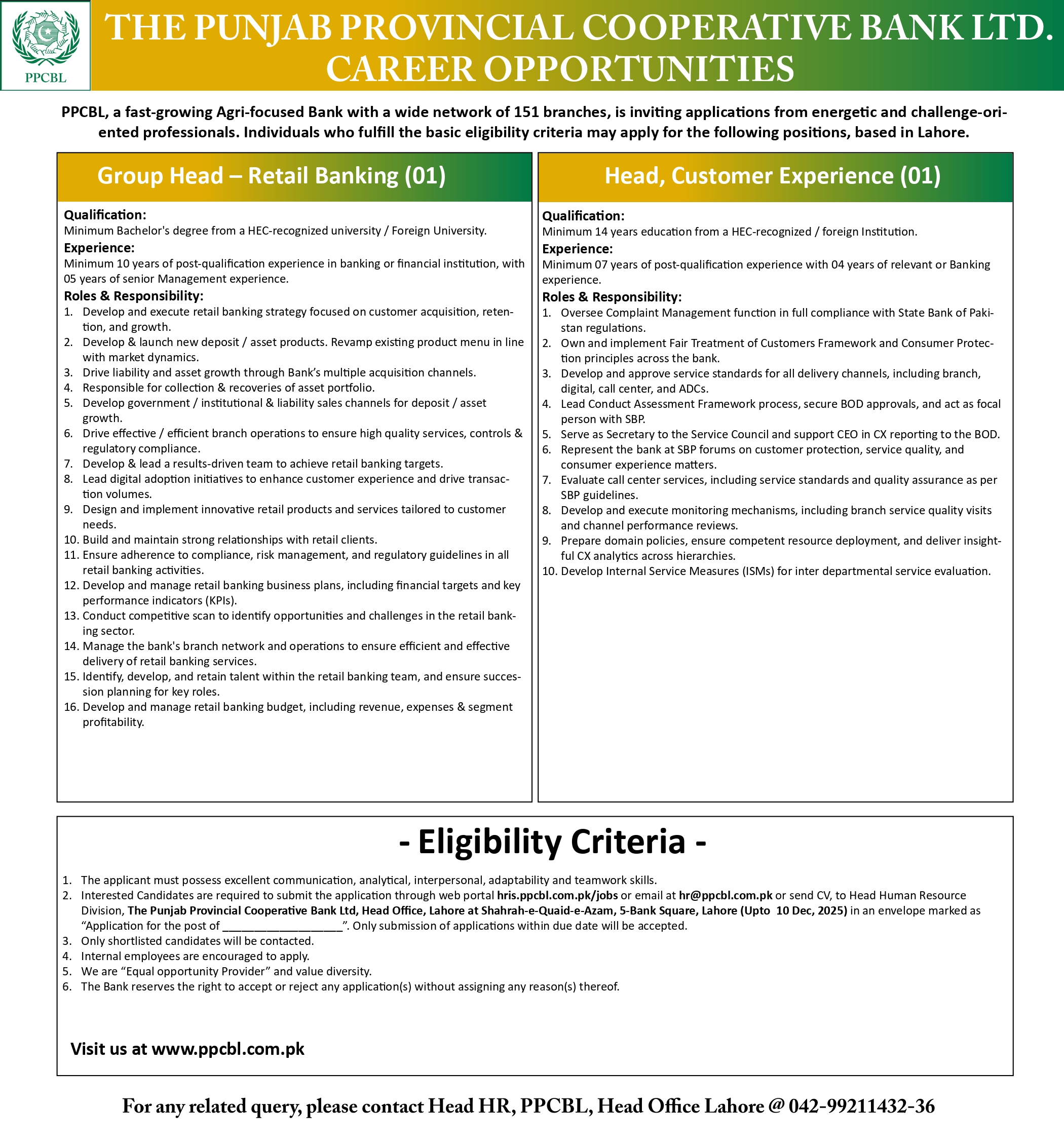 The Punjab Provincial Cooperative Bank Ltd PPCBL jobs advertisement dated about 1 December 2025 in daily Jang Newspaper invites application for the vacant post of head customer experience and group head in Lahore, lahore Punjab Pakistan. Preferred Education is Master and Bachelor etc.
