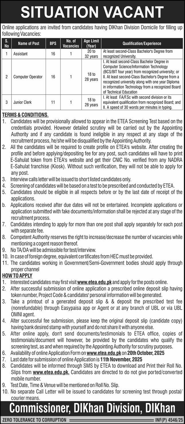 Apply at Commissioner Office latest Government jobs in Human Resource and departments before closing date which is around November 11, 2025 or as per closing date in newspaper ad. Read complete ad online via ETEA to know how to apply on latest Commissioner Office job opportunities.