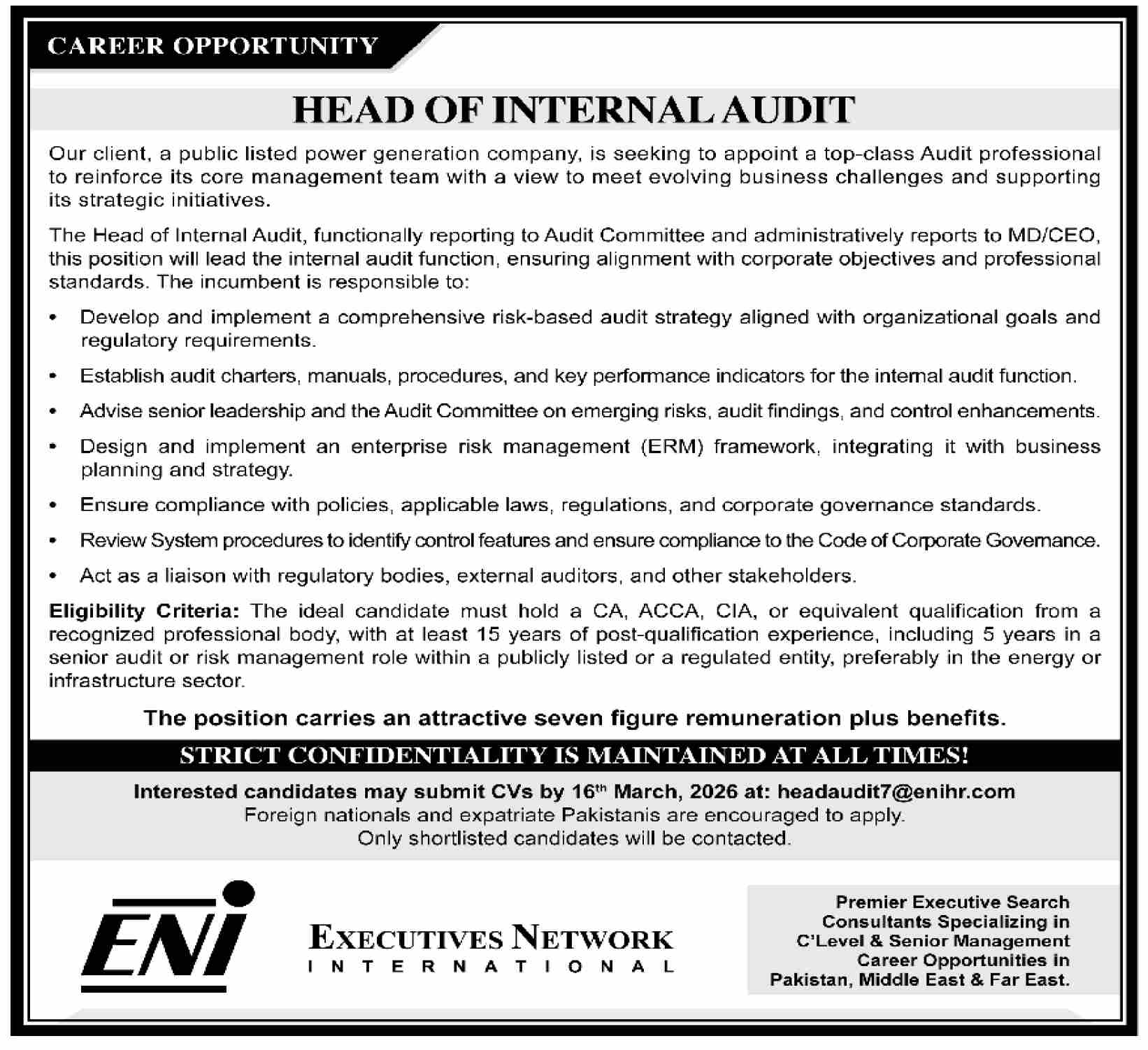NOTE: Interested candidate may submit CV’s at: headaudit7@enihr.com