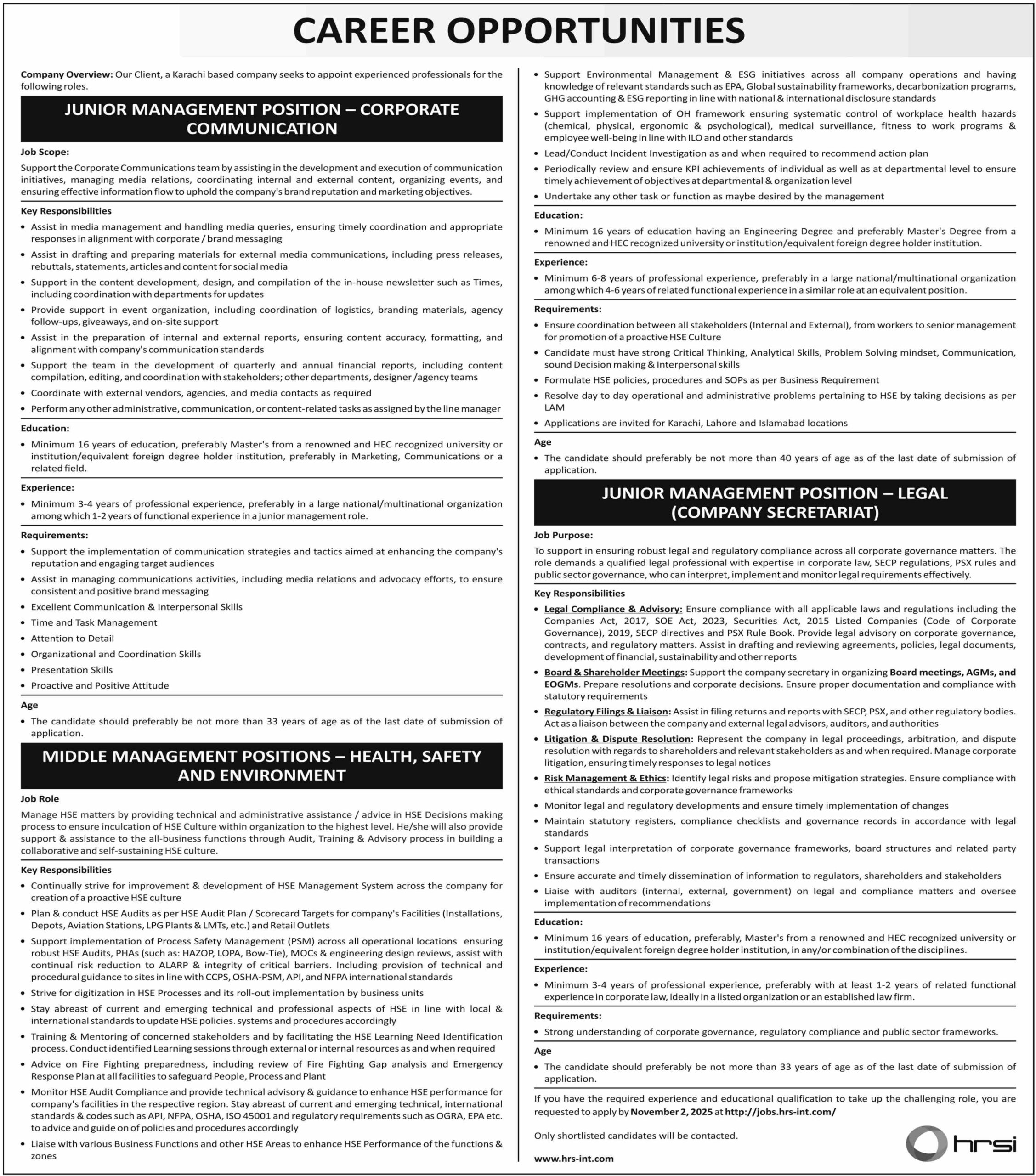 Human Resource Solutions International HRSI latest Government Management jobs and others can be applied till 2 November 2025 or as per closing date in newspaper ad. Read complete ad online to know how to apply on latest Human Resource Solutions International HRSI job opportunities.