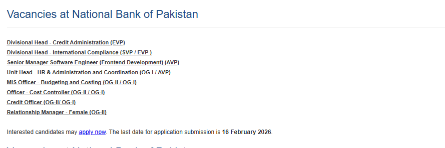 National Bank of Pakistan NBP latest Government Management jobs and others can be applied till 13 February 2026 or as per closing date in newspaper ad. Read complete ad online to know how to apply on latest National Bank of Pakistan NBP job opportunities.