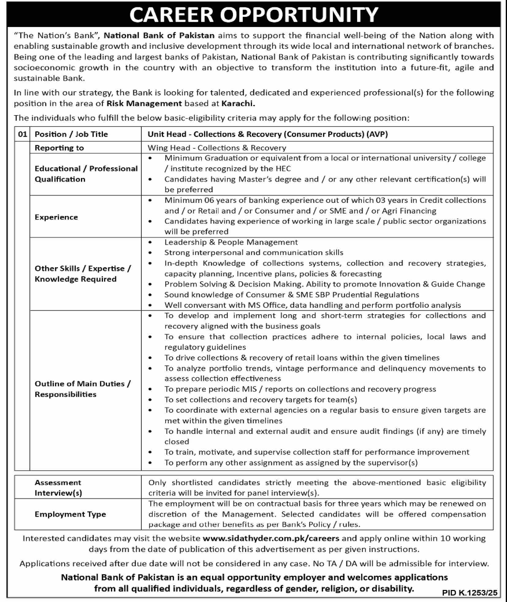 National Bank of Pakistan NBP latest Government Bank jobs and others can be applied till undefined NaN, NaN or as per closing date in newspaper ad. Read complete ad online to know how to apply on latest National Bank of Pakistan NBP job opportunities.
