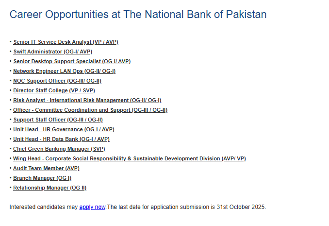 National Bank of Pakistan NBP latest Government Management jobs and others can be applied till October 31, 2025 or as per closing date in newspaper ad. Read complete ad online to know how to apply on latest National Bank of Pakistan NBP job opportunities.