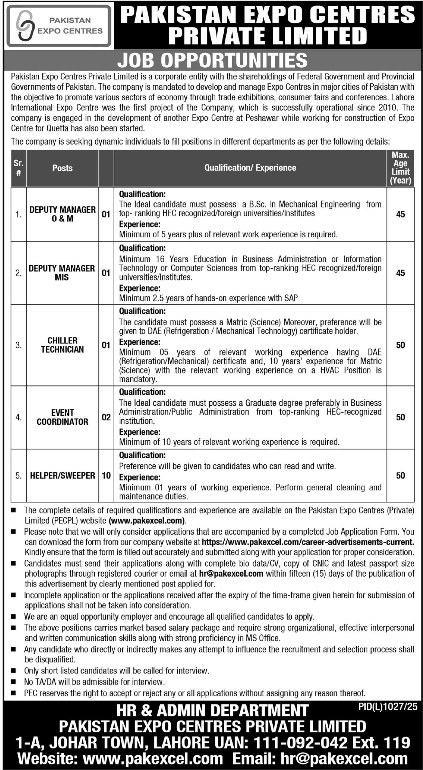 Pakistan Expo Centres Pvt Ltd latest Government Management jobs and others can be applied till 3 November 2025 or as per closing date in newspaper ad. Read complete ad online to know how to apply on latest Pakistan Expo Centers Pvt Ltd job opportunities.