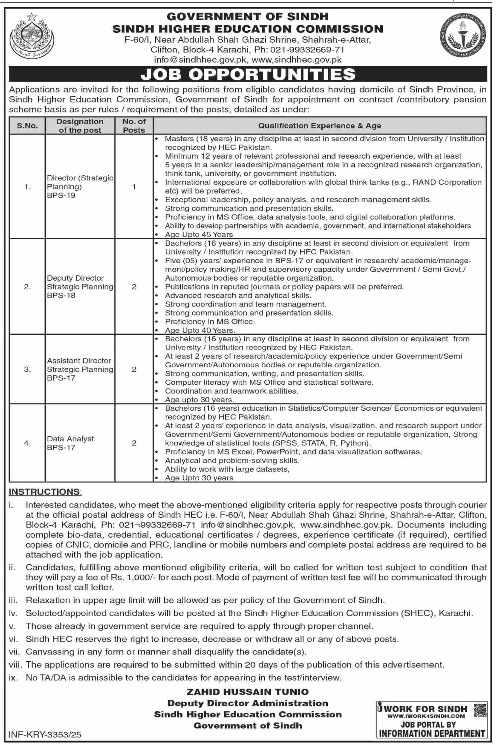Apply at Sindh Higher Education Commission SHEC latest Government jobs in Management and departments before closing date which is around November 8, 2025 or as per closing date in newspaper ad. Read complete ad online to know how to apply on latest Sindh Higher Education Commission SHEC job opportunities.