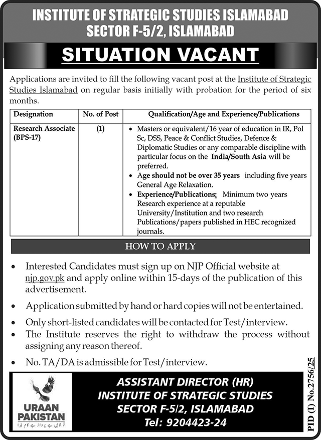 Latest Jobs in The Institute of Strategic Studies Islamabad, Last Date 18-10-2025