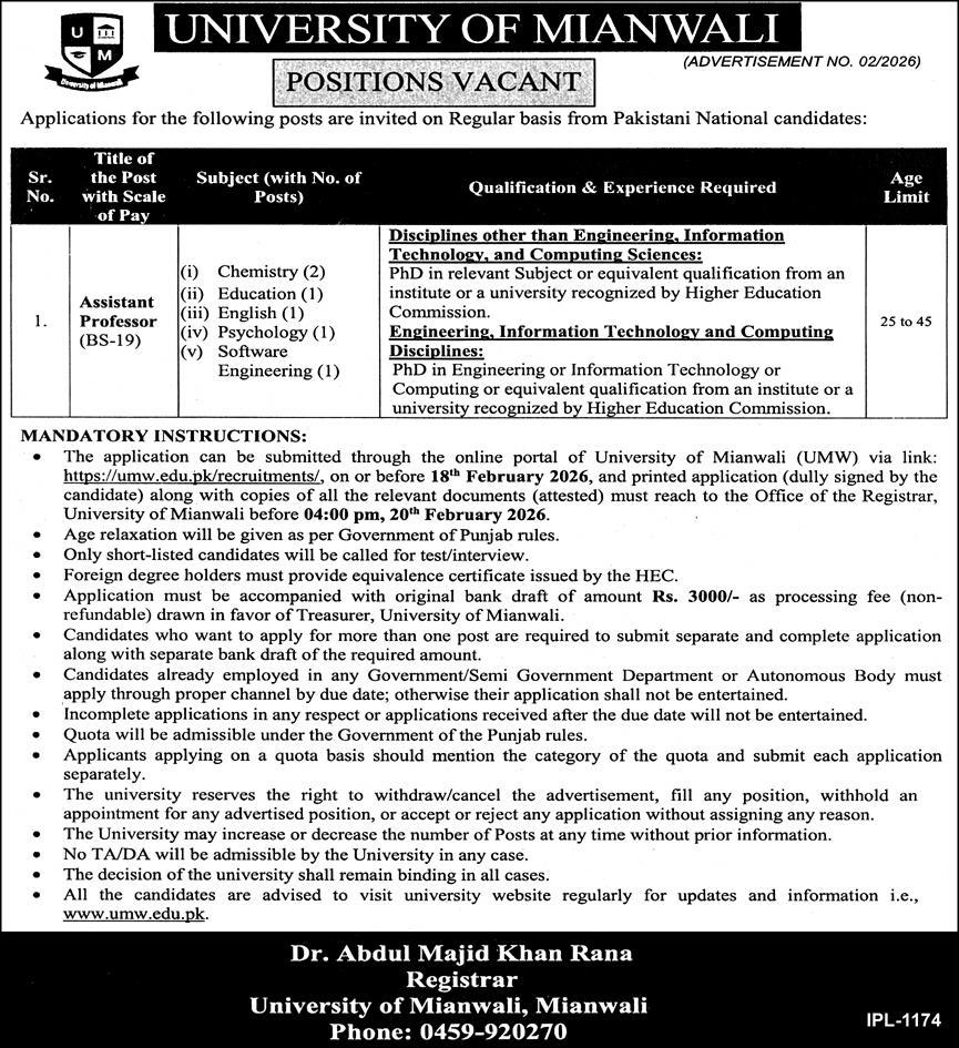 Apply at University of Mianwali latest Government jobs in Education and departments before closing date which is around February 18, 2026 or as per closing date in newspaper ad. Read complete ad online to know how to apply on latest University of Mianwali job opportunities.