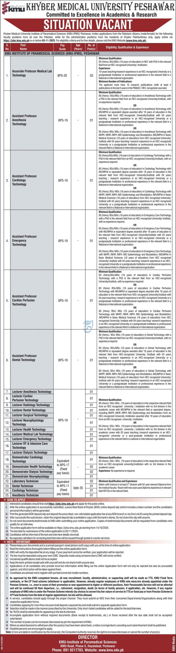 Apply at Khyber Medical University Peshawar latest Government jobs in Management and departments before closing date which is around November 3, 2025 or as per closing date in newspaper ad. Read complete ad online to know how to apply on latest Khyber Medical University Peshawar job opportunities.