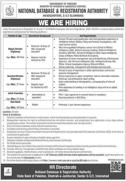 Latest Management jobs and others Government jobs in National Database & Registration Authority NADRA closing date is around February 15, 2026, see exact from ad. Read complete ad online to know how to apply on latest National Database & Registration Authority NADRA job opportunities.