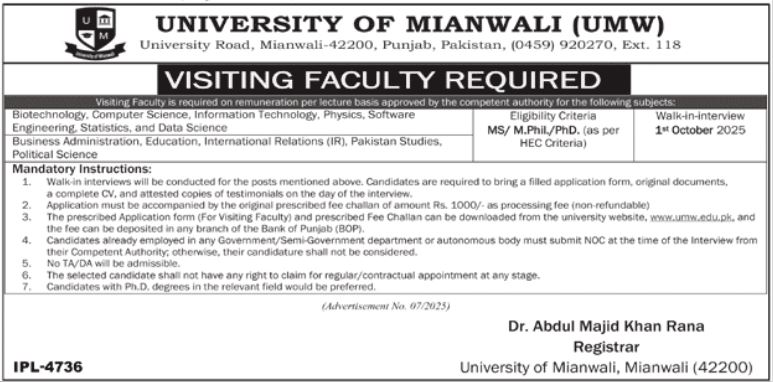 Apply at University of Mianwali latest Government walk in interview jobs in Teaching and departments before closing date which is around October 1, 2025 or as per closing date in newspaper ad. Read complete ad online to know how to apply on latest University of Mianwali job opportunities.