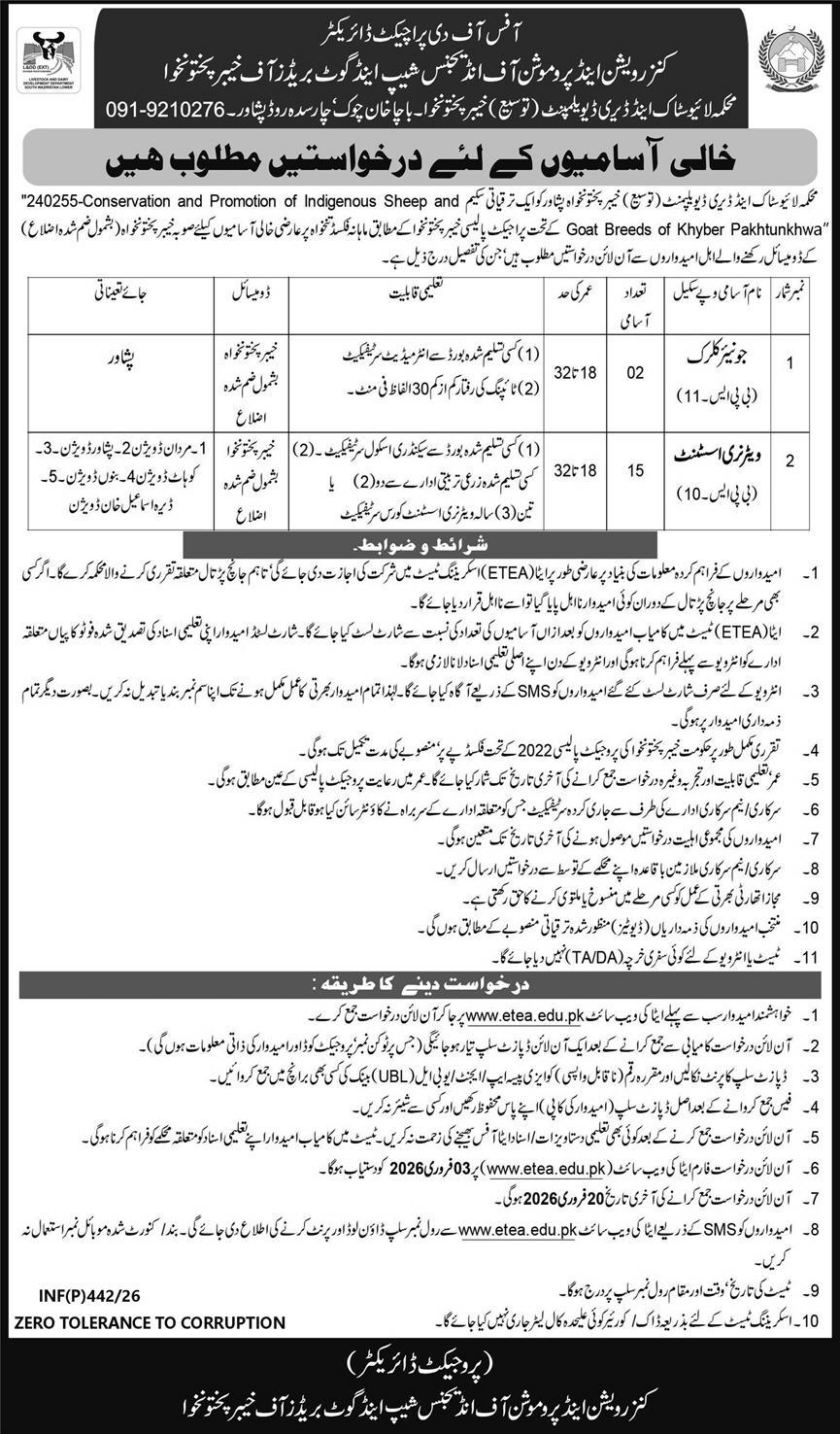 Apply at Livestock & Dairy Development Department latest Government jobs in Management and departments before closing date which is around February 20, 2026 or as per closing date in newspaper ad. Read complete ad online via ETEA to know how to apply on latest Livestock & Dairy Development Department job opportunities.