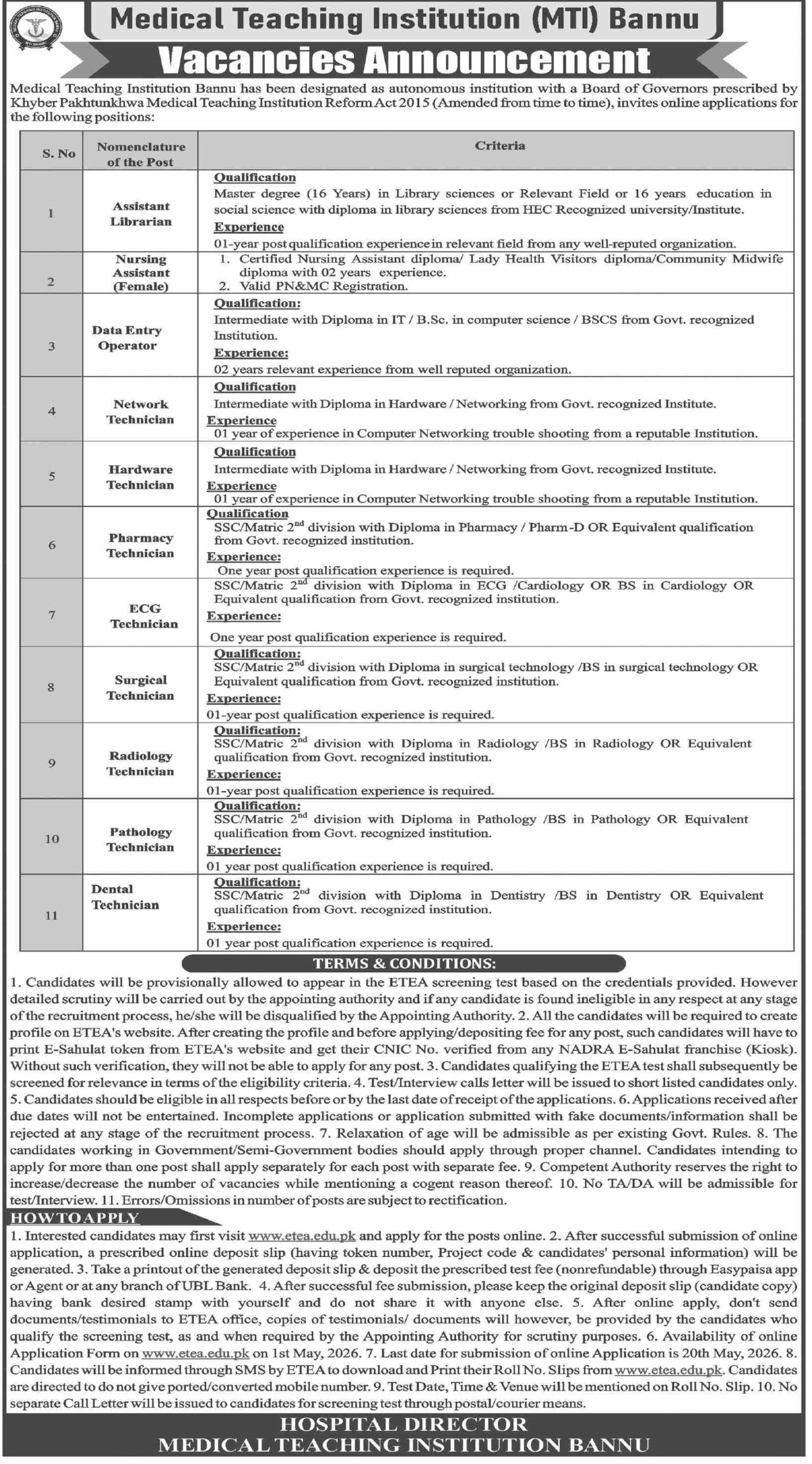 Medical Teaching Institution MTI Bannu Jobs 2026, Last Date 07-05-2026
