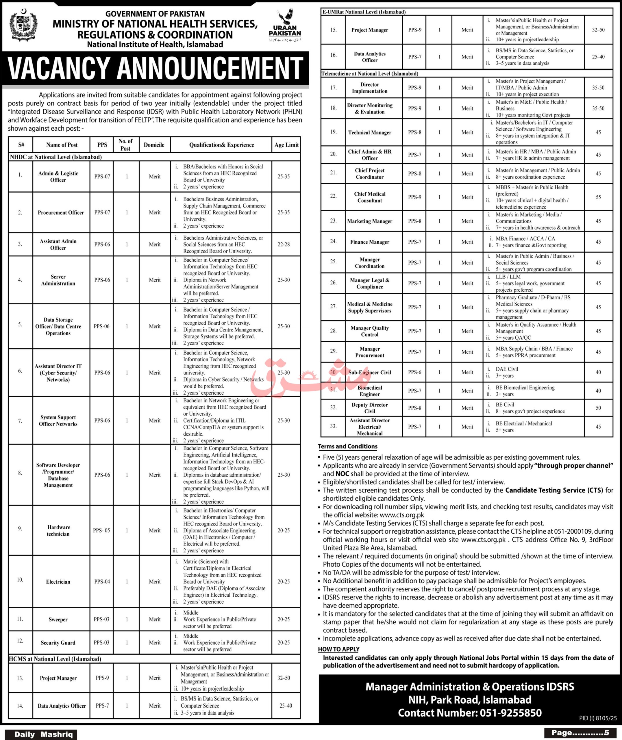 National Institute of Health NIH Islamabad jobs are highly attractive for individuals seeking careers in healthcare, research, and public administration. The institute regularly offers a wide range of career opportunities in medical sciences, microbiology, virology, biotechnology, laboratory technology, and administrative roles. Positions such as research officers, lab technicians, data analysts, public health specialists, and administrative staff are commonly announced. These jobs are open to candidates with qualifications ranging from Intermediate to Bachelor’s, Master’s, and professional medical degrees, making NIH an excellent workplace for both fresh graduates and experienced professionals. Employees benefit from competitive salary packages, job stability, and opportunities to work on national-level health projects and research initiatives.