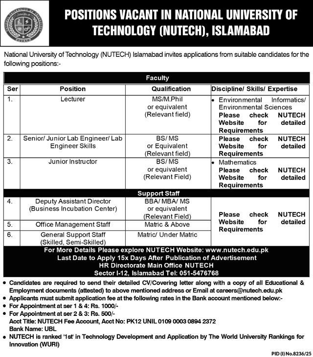 National University of Technology NUTECH Islamabad jobs are highly attractive for individuals seeking careers in the education and technical sectors. The university regularly announces diverse job opportunities in teaching, research, administration, and technical support fields. Positions such as professors, lecturers, lab engineers, research associates, IT specialists, and administrative staff are commonly advertised. These roles are open to candidates with qualifications ranging from Bachelor’s and Master’s degrees to MPhil and PhD, depending on the position. Both fresh graduates and experienced professionals can apply, making NUTECH an excellent platform for career growth and professional development. Employees benefit from competitive salary packages, a professional work environment, and opportunities to engage in research and innovation projects.