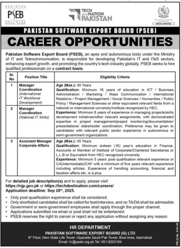Latest Government jobs in Pakistan Software Export Board PSEB in Management and others can be applied till 28 September 2025 or as per closing date in newspaper ad. Read complete ad online to know how to apply on latest Pakistan Software Export Board PSEB job opportunities.