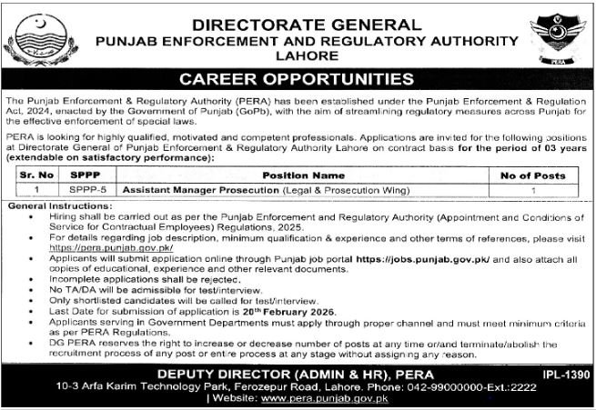 Punjab Enforcement and Regulatory Authority PERA latest Government Legal jobs and others can be applied till February 20, 2026 or as per closing date in newspaper ad. Read complete ad online to know how to apply on latest Punjab Enforcement and Regulatory Authority PERA job opportunities.