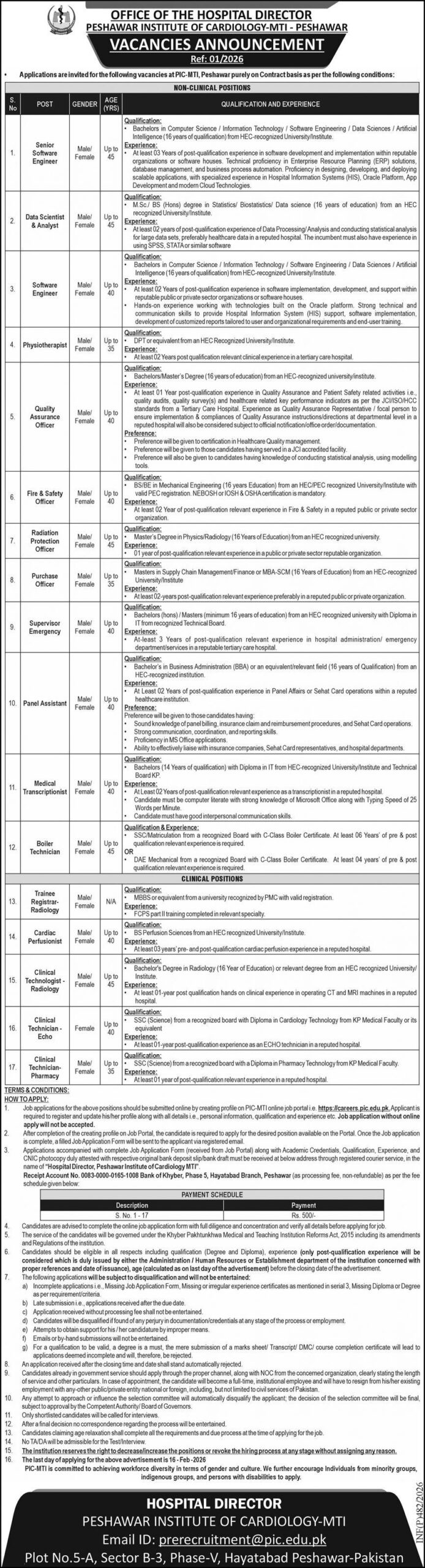 Peshawar Institute of Cardiology PIC latest Government Education jobs and others can be applied till 16 February 2026 or as per closing date in newspaper ad. Read complete ad online to know how to apply on latest Peshawar Institute of Cardiology PIC job opportunities.