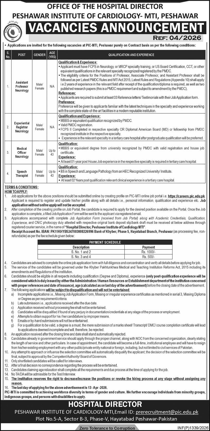 For job seekers exploring the latest PIC MTI jobs in Peshawar, platforms like jobelloo.com provide timely updates, application details, and eligibility criteria. Whether you are aiming for healthcare jobs in Pakistan or administrative roles in a reputed public sector organization, Peshawar Institute of Cardiology PIC MTI stands out as a top choice. Stay connected with jobelloo.com to find the latest PIC jobs, career updates, and secure your future in the growing medical sector of Pakistan.