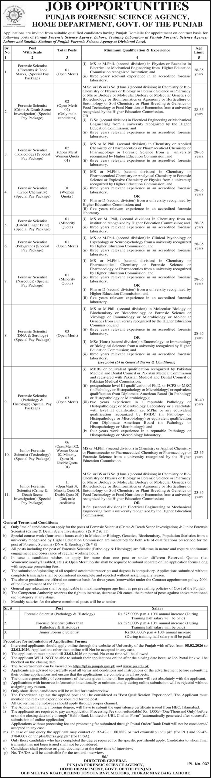 Punjab Forensic Science Agency Lahore Jobs, Last Date 22-02-2026