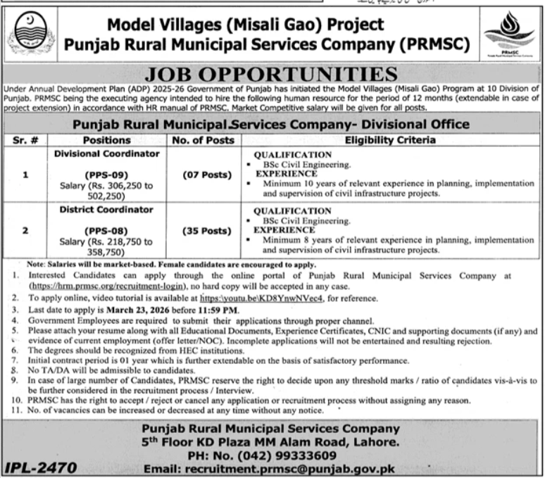PRMSC jobs in Punjab are highly attractive for professionals seeking government sector employment with competitive salaries and career growth opportunities. Job seekers interested in the latest PRMSC jobs can find detailed information about vacancies, eligibility criteria, and application procedures through official announcements and trusted job portals. Working with PRMSC allows professionals to contribute to sustainable rural development while building a stable and rewarding career in the public sector of Pakistan.