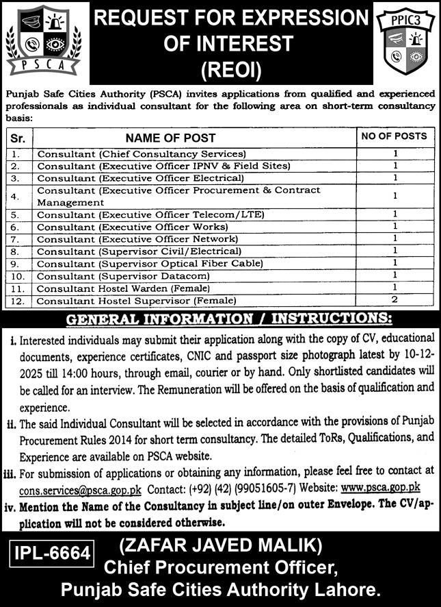 Punjab Safe Cities Authority PSCA latest Government Management jobs and others can be applied till 10 December 2025 or as per closing date in newspaper ad. Read complete ad online to know how to apply on latest Punjab Safe Cities Authority PSCA job opportunities.