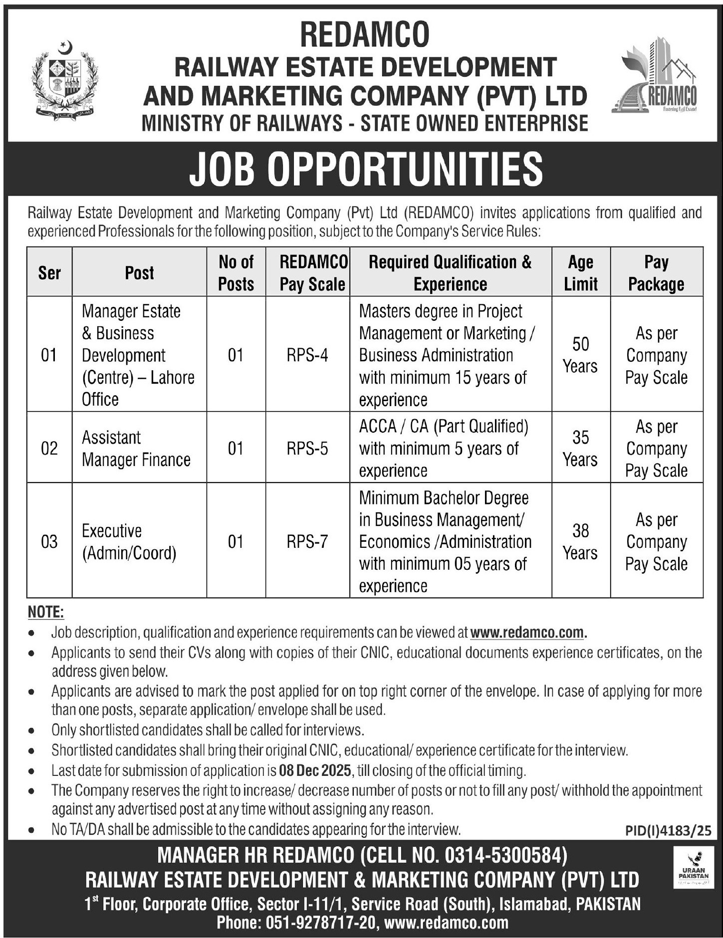 Apply at Railway Estate Development & Marketing Company Pvt Ltd REDMC latest Government jobs in Management and departments before closing date which is around December 8, 2025 or as per closing date in newspaper ad. Read complete ad online to know how to apply on latest Railway Estate Development & Marketing Company Pvt Ltd REDMC job opportunities.