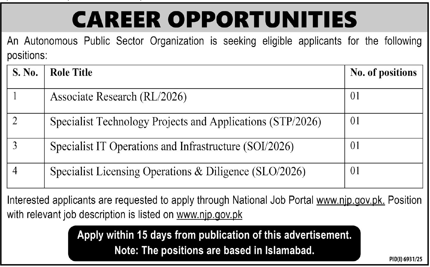 - Specialist Technology Projects and Applications (01 Position)
