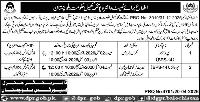 - Supervisors (02 Positions) Makran and Quetta Divisions