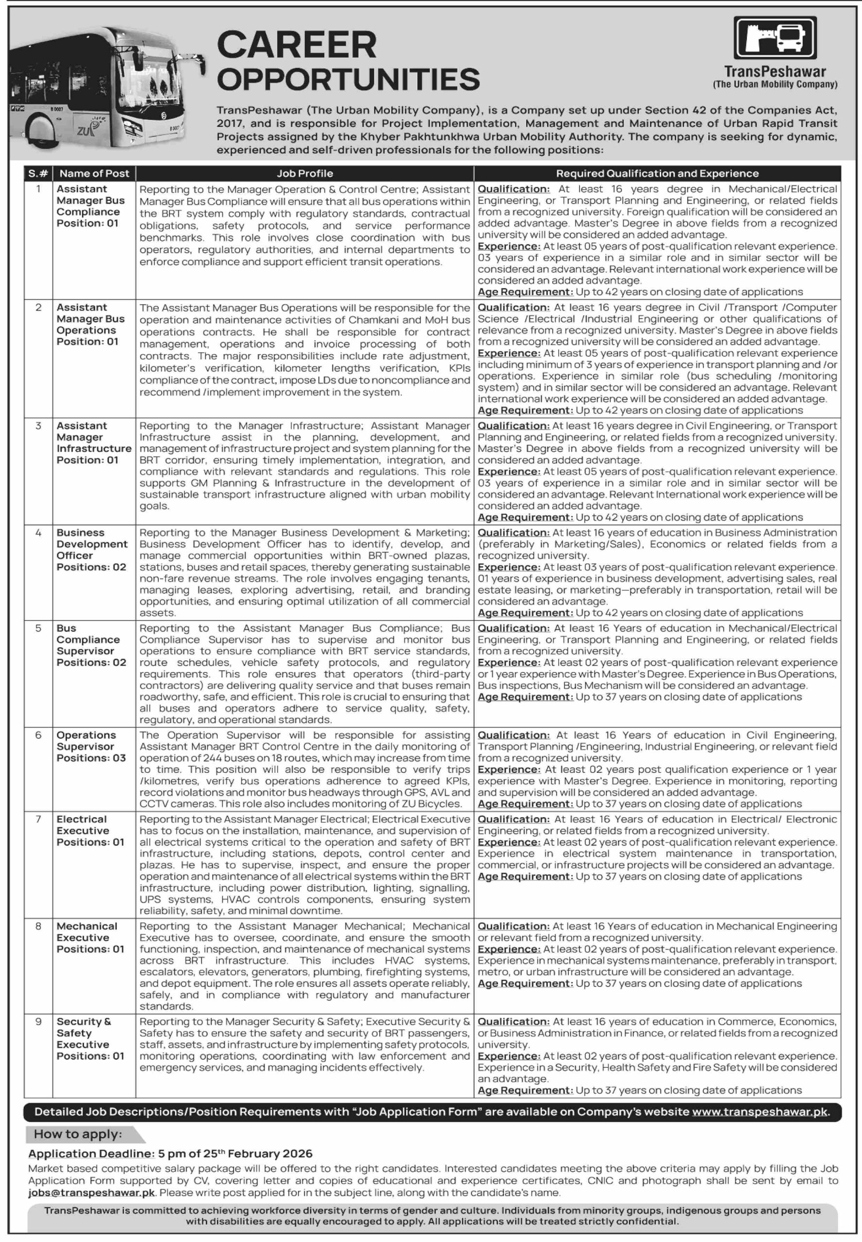 Trans Peshawar The Urban Mobility Company latest Government Management jobs and others can be applied till 25 February 2026 or as per closing date in newspaper ad. Read complete ad online to know how to apply on latest Trans Peshawar The Urban Mobility Company job opportunities.