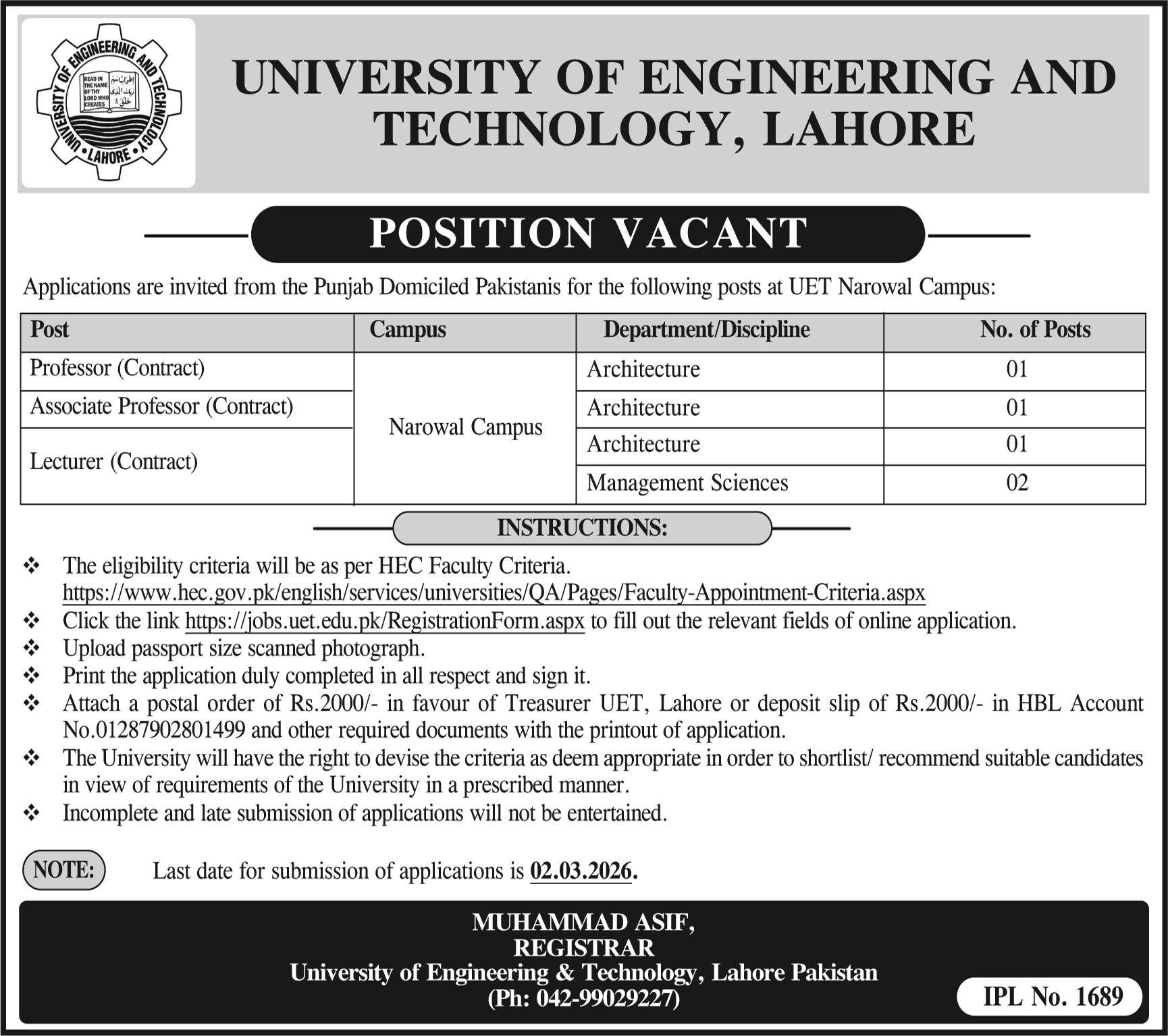 University Of Engineering And Technology UET Jobs, Last Date 04-03-2026