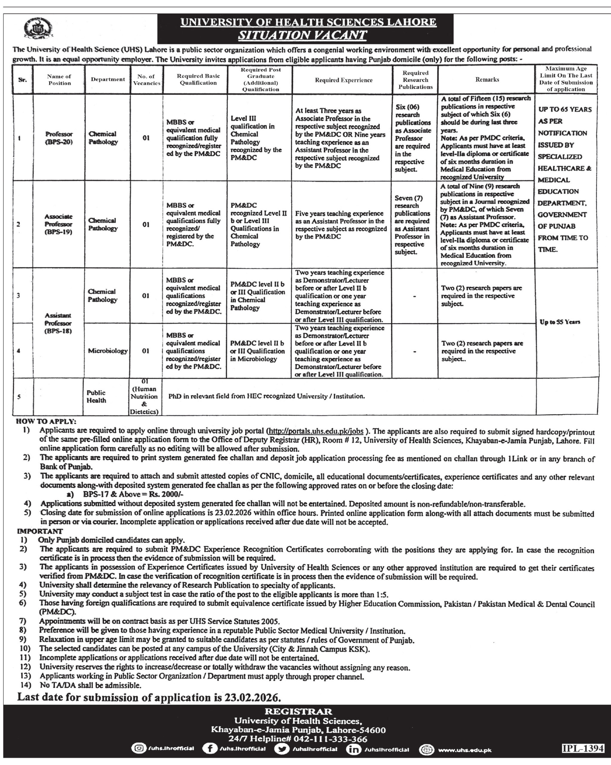 University Of Health Sciences UHS Lahore Jobs 2026, Last Date 23-02-2026